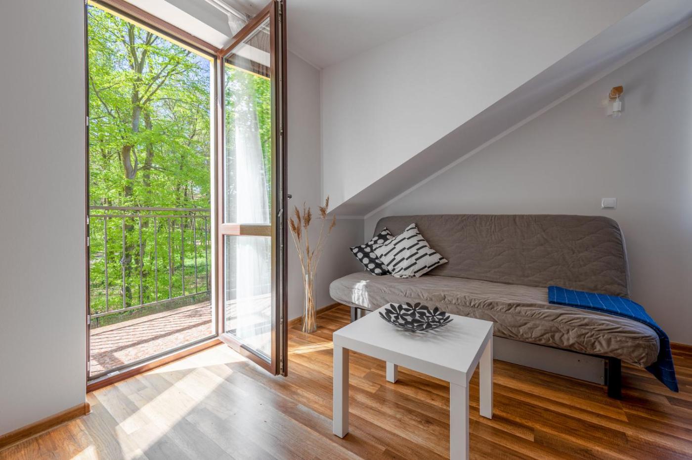 Apartament – parter. Ten apartament z oddzielnym wejściem mieści salon, oddzielną sypialnię oraz łazienkę z kabiną prysznicową i suszarką do włosów. W doskonale wyposażonej kuchni znajdują się przybory kuchenne, płyta kuchenna, lodówka i kuchenka mikrofalowa. Apartament oferuje jadalnię, szafę, czajnik elektryczny i telewizor z płaskim ekranem. Z okien roztacza się widok na ogród. W tej opcji zakwaterowania dostępne są 4 łóżka. Apartament - 5 osobowy. Powierzchnia pokoju ok.: 30 mkw. ;